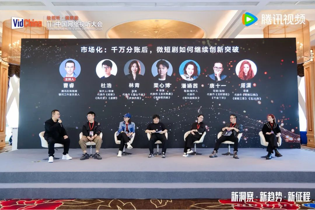 在精品化創(chuàng)制、多元類型布局的思路指引下,一批熱度與口碑兼具的微短劇涌現(xiàn)市場。在第一個圓桌對話環(huán)節(jié),騰訊在線視頻銀河工作室負(fù)責(zé)人曹睿作為主持人,與六位導(dǎo)演:《招惹》總制片人杜浩、《反詐風(fēng)暴》導(dǎo)演栗心博、《盲心千金》導(dǎo)演林青、《我叫趙吳狄》導(dǎo)演潘嬿茜、《見好就收》導(dǎo)演唐十一、《授她以柄》導(dǎo)演周瀟,共議“千萬分賬后微短劇如何繼續(xù)創(chuàng)新突破”。幾位嘉賓以“求新”為關(guān)鍵詞,分別分享自身在微短劇創(chuàng)作上關(guān)于新題材、新內(nèi)容、新情緒、新呈現(xiàn)的創(chuàng)新思路,并提出“以‘小體量’追求‘大格局’”、“情緒是最佳原動力”等創(chuàng)作理念。